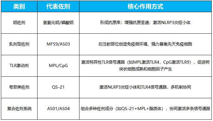 下表呈现了目前疫苗佐剂的类别,以及每一分类在机体内的主要作用方式: