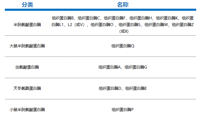 组织蛋白酶是一种半胱氨酸蛋白酶,能够降解弹性蛋白和纤维状胶原蛋白。此外,组织蛋白酶还是一种与细胞溶酶体相关的内肽酶,其最适pH值通常较低。组织蛋白酶参与溶酶体内蛋白质降解以及多种其他生理和病理过程。由于其广泛的底物特异性,组织蛋白酶之间可以相互补偿。