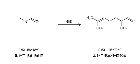 2.通过N,N-二甲基甲酰胺合成2,6-二甲基-5-庚烯醛,收率约68%;