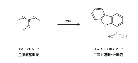 2.通过三甲氧基硼烷合成二苯并噻吩-4-硼酸,收率约79%;