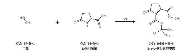 2.通过甲醇和L-焦谷氨酸合成Boc-L-焦谷氨酸甲酯,收率约77%;