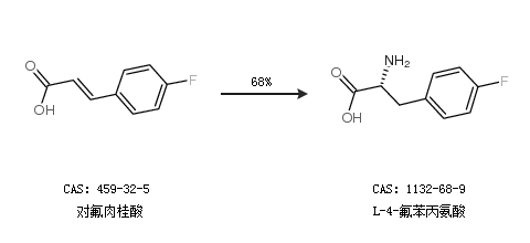 1.通过对氟肉桂酸合成L-4-氟苯丙氨酸,收率约68%;