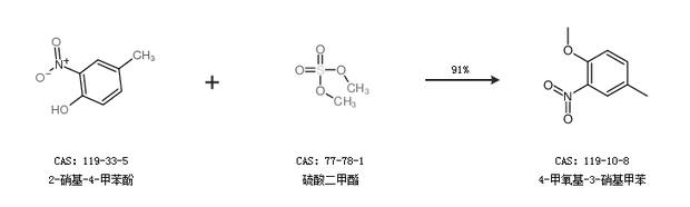 1.通过2-硝基-4-甲苯酚和硫酸二甲酯合成4-甲氧基-3-硝基甲苯,收率约91%;
