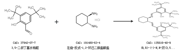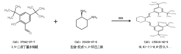 中文别名 	(R,R)-(-)-N,N’-双(3,5-二叔丁基亚水杨基)-1,2-环己二胺;(R,R)-(﹠#8722﹔)-N,N''-双(3,5-二叔丁基亚水杨基)-1,2-环已二胺;(R,R)-(?)-N,N''-双(3,5-二叔丁基亚水杨基)-1,2-环已二胺;(R,R)-雅可布逊配体;(R,R)-(-)-N,N''-双(3,5-二叔丁基亚水杨基)-1,2-环已二胺;(R,R)-Jacobsen配体;(R,R)-(-)-N,N''-双(3,5-二叔丁基亚水杨基)-1,2-环己烷二胺;