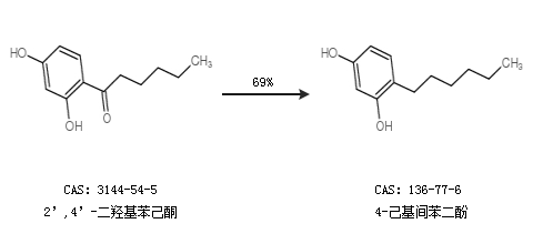 1.通过2’,4’-二羟基苯己酮合成4-己基间苯二酚,收率约69%;