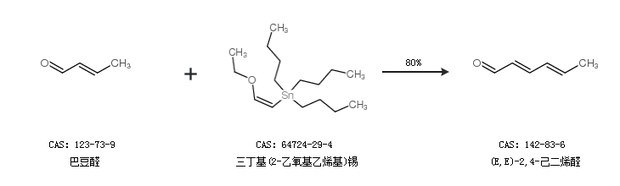 2.通过巴豆醛和三丁基(2-乙氧基乙烯基)锡合成(E,E)-2,4-己二烯醛,收率约80%;