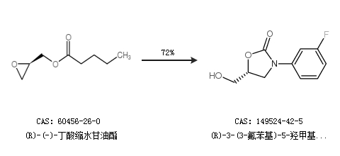 2.通过(R)-(-)-丁酸缩水甘油酯合成(R)-3-(3-氟苯基)-5-羟甲基恶唑烷-2-酮,收率约72%;