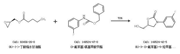 1.通过(R)-(-)-丁酸缩水甘油酯和(3-氟苯基)氨基甲酸苄酯合成(R)-3-(3-氟苯基)-5-羟甲基恶唑烷-2-酮,收率约70%;