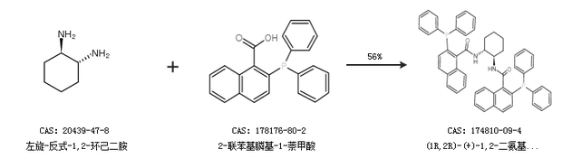 1.通过左旋-反式-1,2-环己二胺和2-联苯基膦基-1-萘甲酸合成(1R,2R)-(+)-1,2-二氨基环己烷-N,N′-双(2-苯基膦-1-萘酰基),收率约56%;