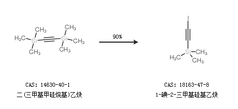 2.通过二(三甲基甲硅烷基)乙炔合成1-碘-2-三甲基硅基乙炔,收率约90%;