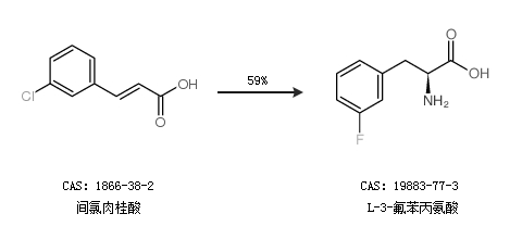 1.通过间氯肉桂酸合成L-3-氟苯丙氨酸,收率约59%;