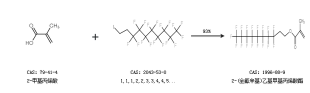 2.通过2-甲基丙烯酸和1,1,1,2,2,3,3,4,4,5,5,6,6,7,7,8,8-十七氟-10-碘庚烷合成2-(全氟辛基)乙基甲基丙烯酸酯,收率约93%;