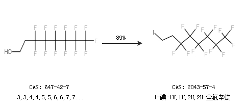 1.通过3,3,4,4,5,5,6,6,7,7,8,8,8-十三氟-1-辛醇合成1-碘-1H,1H,2H,2H-全氟辛烷,收率约89%;