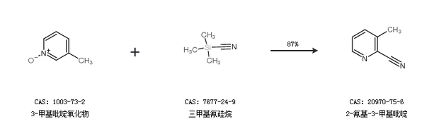 2.通过3-甲基吡啶氧化物和三甲基氰硅烷合成2-氰基-3-甲基吡啶,收率约87%;