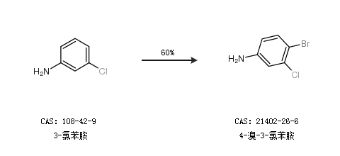 2.通过3-氯苯胺合成4-溴-3-氯苯胺,收率约60%;