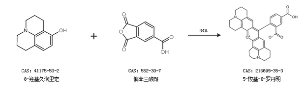 1.通过8-羟基久洛里定和偏苯三酸酐合成5-羧基-X-罗丹明,收率约34%;