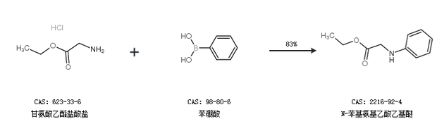 1.通过甘氨酸乙酯盐酸盐和苯硼酸合成N-苯基氨基乙酸乙基醚,收率约83%;