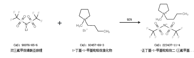 1.通过双三氟甲烷磺酰亚胺锂和1-丁基-1-甲基吡咯烷溴化物合成1-正丁基-1-甲基吡咯烷二(三氟甲基磺酰)酰亚胺,收率约92%;
