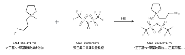 2.通过1-丁基-1-甲基吡咯烷碘化物和双三氟甲烷磺酰亚胺锂合成1-正丁基-1-甲基吡咯烷二(三氟甲基磺酰)酰亚胺,收率约86%;