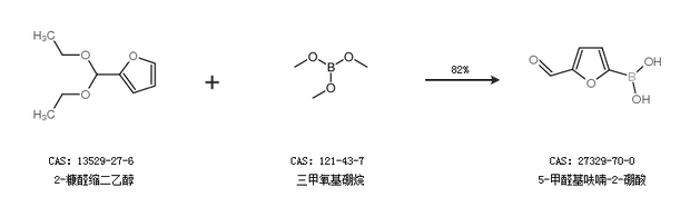 1.通过2-糠醛缩二乙醇和三甲氧基硼烷合成5-甲醛基呋喃-2-硼酸,收率约82%;