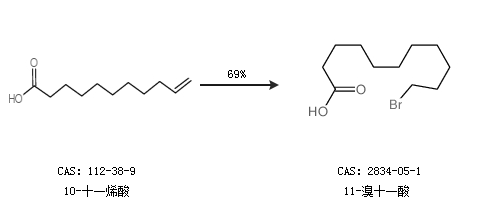 1.通过10-十一烯酸合成11-溴十一酸,收率约69%;
