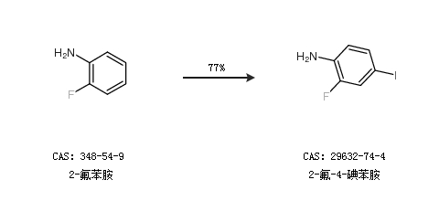 1.通过2-氟苯胺合成2-氟-4-碘苯胺,收率约77%;
