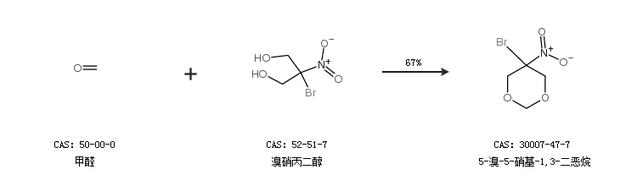 1.通过甲醛和溴硝丙二醇合成5-溴-5-硝基-1,3-二恶烷,收率约67%;