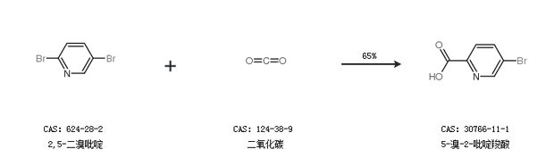 1.通过2,5-二溴吡啶和二氧化碳合成5-溴-2-吡啶羧酸,收率约65%;