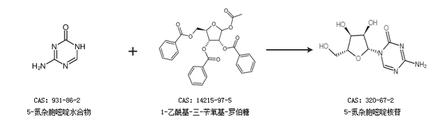 1.通过1-乙酰基-2,3,5-三苯甲酰氧基-1-beta-D-呋喃核糖和N-(三甲基硅基)-4-(三甲基硅氧基)-1,3,5-三嗪-2-胺合成5-氮杂胞嘧啶核苷,收率约71%;