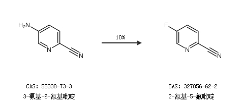 1.通过3-氨基-6-氰基吡啶合成2-氰基-5-氟吡啶,收率约10%;