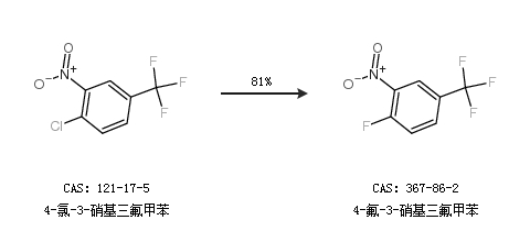 1.通过4-氯-3-硝基三氟甲苯合成4-氟-3-硝基三氟甲苯,收率约81%;