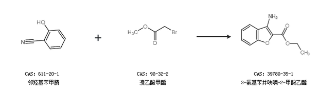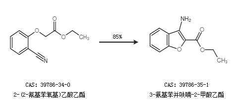1.通过2-(2-氰基苯氧基)乙酸乙酯合成3-氨基苯并呋喃-2-甲酸乙酯,收率约85%;