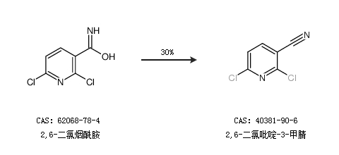 1.通过2,6-二氯烟酰胺合成2,6-二氯吡啶-3-甲腈,收率约30%;