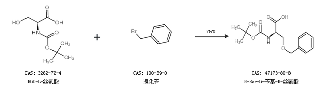 1.通过BOC-L-丝氨酸和溴化苄合成N-Boc-O-苄基-D-丝氨酸,收率约75%;