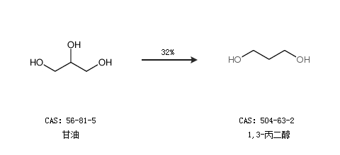 1.通过甘油合成1,3-丙二醇,收率约32%;