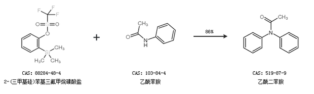 2.通过2-(三甲基硅)苯基三氟甲烷磺酸盐和乙酰苯胺合成乙酰二苯胺,收率约86%;