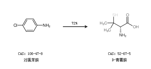1.通过对氯苯胺合成D-青霉胺,收率约72%;
