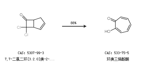 1.通过7,7-二氯二环[3.2.0]庚-2-烯-6-酮合成环庚三烯酚酮,收率约88%;