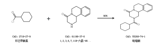 2.通过环己甲酰氯和1,2,3,6,7,11B-六氢-4H-吡嗪并[2,1-Alpha]异喹啉-4-酮合成吡喹酮,收率约90%;