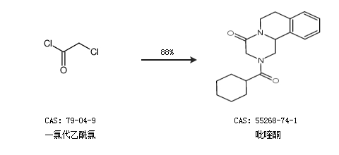 1.通过一氯代乙酰氯合成吡喹酮,收率约88%;