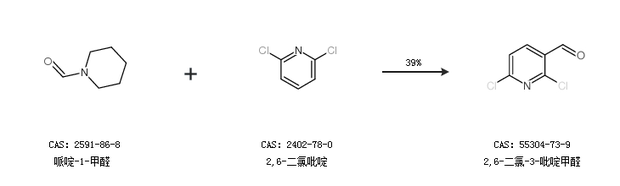 2.通过哌啶-1-甲醛和2,6-二氯吡啶合成2,6-二氯-3-吡啶甲醛,收率约39%;