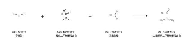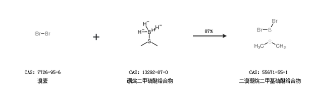 1.通过溴素和硼烷二甲硫醚络合物合成二溴硼烷二甲基硫醚络合物,收率约87%;