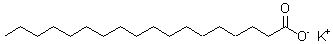 硬脂酸钾外观为细白色、蓬松粉末,手感滑腻,无砂感,有脂肪气味,可溶于热水或醇,缓溶于冷水,水溶液对石蕊和酚酞均呈强碱性,但乙醇溶液对酚酞仅呈微碱性。溶液因水解呈碱性。
