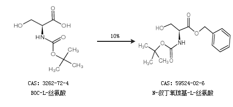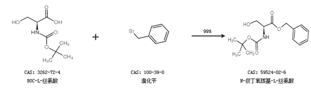 1.通过BOC-L-丝氨酸和溴化苄合成N-叔丁氧羰基-L-丝氨酸,收率约99%;