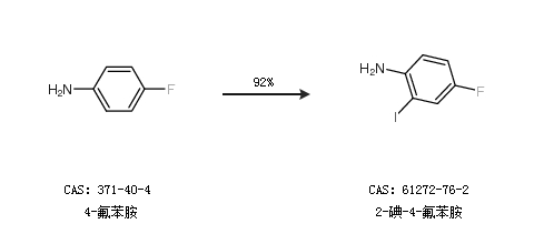 1.通过4-氟苯胺合成2-碘-4-氟苯胺,收率约92%;