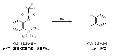 2.通过2-(三甲基硅)苯基三氟甲烷磺酸盐合成1,2-二碘苯,收率约80%;