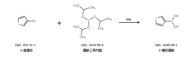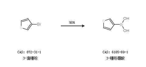 用于合成中间体。3-噻吩硼酸分子中引入了噻吩基团成为了非常有用的试剂。在Suzuki-Miyaura偶联反应中,加入钯催化剂,2-噻吩基硼酸与5-溴嘧啶衍生物反应得到73%的5-(2-噻吩) 嘧啶衍生物.1)