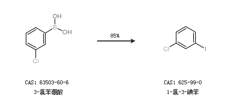 1.通过3-氯苯硼酸合成1-氯-3-碘苯,收率约85%;