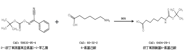 2.通过2-(叔丁氧羰基氧亚氨基)-2-苯乙腈和6-氨基己酸合成叔丁氧羰酰基6-氨基己酸,收率约96%;