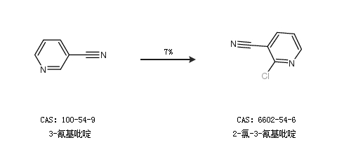 1.通过3-氰基吡啶合成2-氯-3-氰基吡啶,收率约7%;